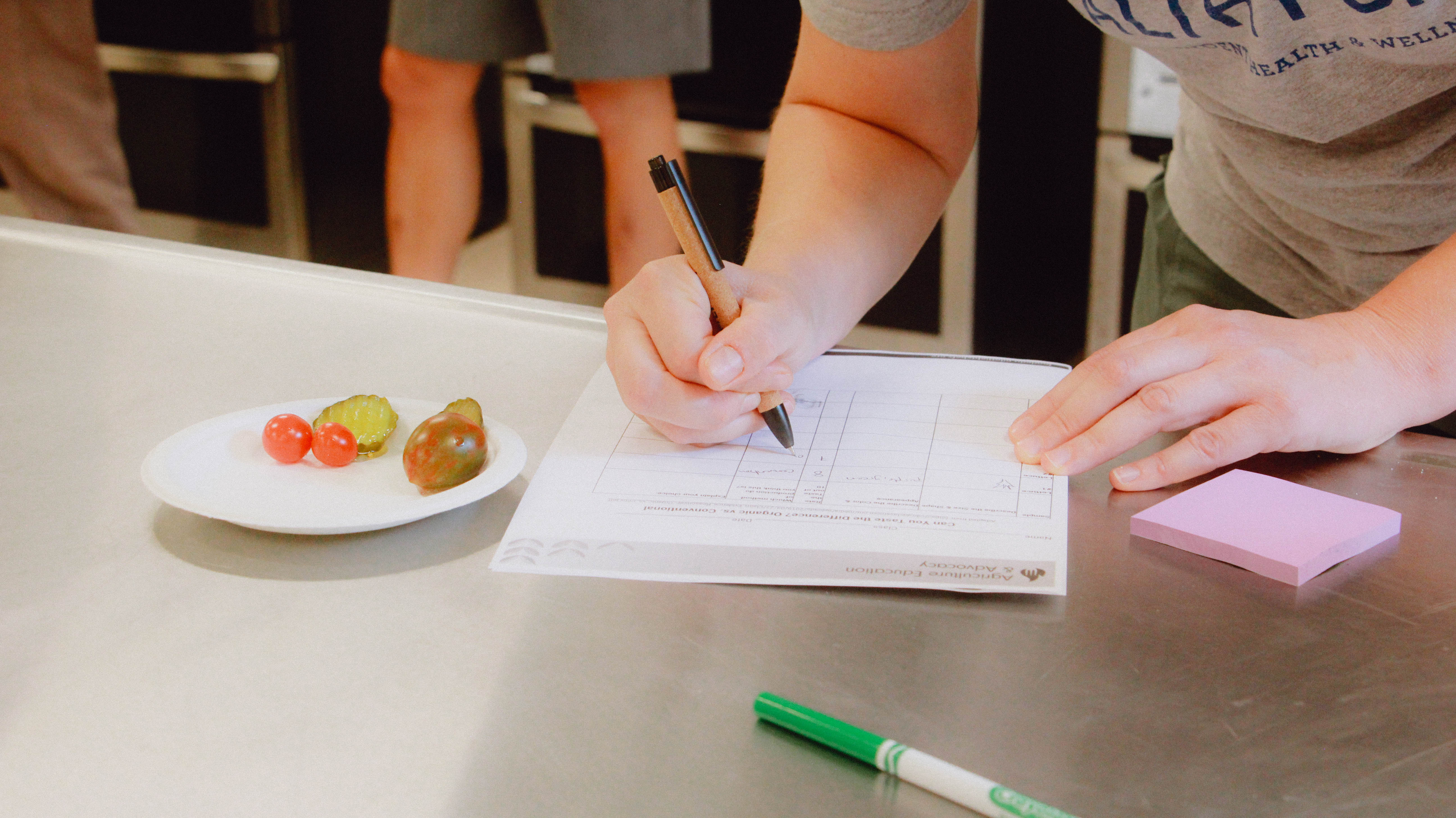 Breakout room one, designed around the agriculture education lesson “Organic vs. Conventional: How Do We Grow Our Food?” was co-led by Food Education Fellowship Director Caitlin Arens and Contemporary Farmer Inc. Founder Daviiid Toledo. In this lesson, students practice planting cucumber seeds while they learn about the differences between dirt and soil. Then, they have the opportunity to taste test different types of produce to see if they can identify which have been grown conventionally and which have been grown organically. Finally, students review what they learned and compare and contrast the similarities and differences between the two growing methods.